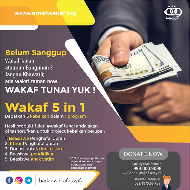 referensimuslim.com – Seiring dengan ekspektasi yang semakin BESAR dari masyarakat terhadap Yayasan Assyifa, yayasan juga mempunyai cita-cita BESAR memberikan kebermanfaatan kepada masyarakat, maka mulai 2020 melalui BADAN WAQAF ASSYIFA telah diluncurkan Program Waqaf Tunai yang akan disalurkan untuk beasiswa pendidikan, beasiswa para penghapal quran dan beasiswa anak yatim dan dhuafa.